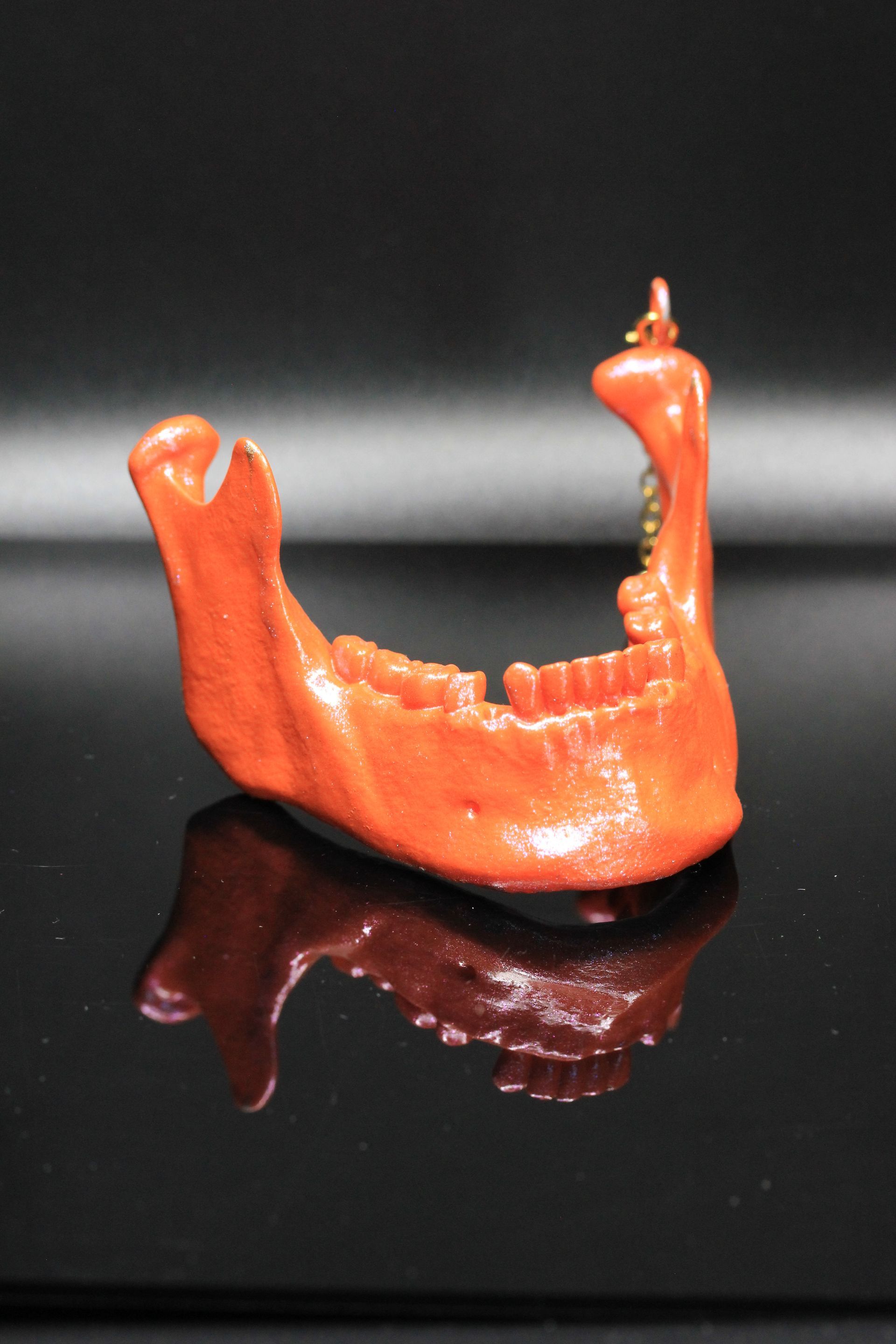 Intricately crafted and beautifully painted, this child-size jawbone ornament stands as a hauntingly stunning piece of art, perfect for any collector who appreciates unique and thought-provoking items. Its exquisite detailing captures the eye, while the delicate craftsmanship showcases the artist's skill and vision. Whether displayed as a standalone statement piece or incorporated into a larger collection, this ornament is sure to evoke curiosity and admiration, making it a must-have addition for those who seek out the extraordinary.