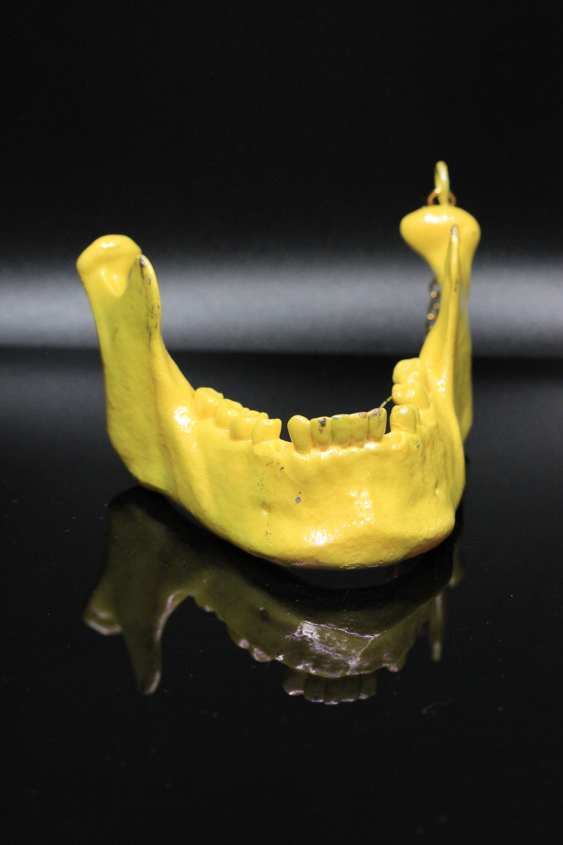 Intricately crafted and beautifully painted, this child-size jawbone ornament stands as a hauntingly stunning piece of art, perfect for any collector who appreciates unique and thought-provoking items. Its exquisite detailing captures the eye, while the delicate craftsmanship showcases the artist's skill and vision. Whether displayed as a standalone statement piece or incorporated into a larger collection, this ornament is sure to evoke curiosity and admiration, making it a must-have addition for those who seek out the extraordinary.